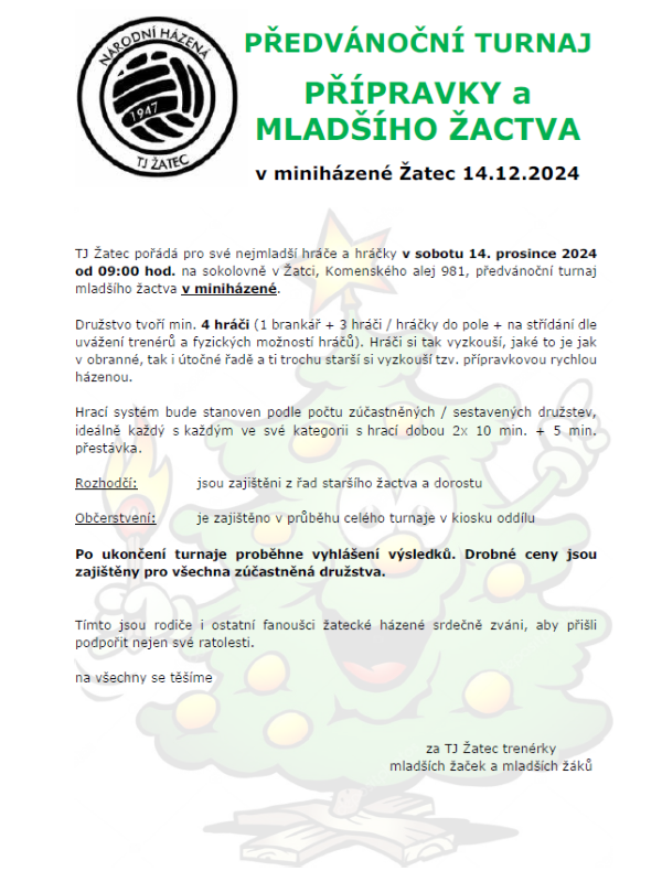 Předvánočního turnaje v miniházené se letos zúčastnilo 20 dětí, které byly rozděleny do 2 přípravkových družstev a 4 družstev mladšího žactva. I když dnes ani tak moc nešlo o góly a výhry, ale především si společně zahrát a zablbnout, všichni – včetně diváků – netrpělivě čekali, jak dopadl miniturnaj v kategorii mladšího žactva, kdy po zisku stejného počtu bodů na vzájemné zápasy vyhrálo družstvo č. 4. Za bojovnou hru si všechny děti vysloužily sladkou odměnu, kterou každé družstvo obdrželo.